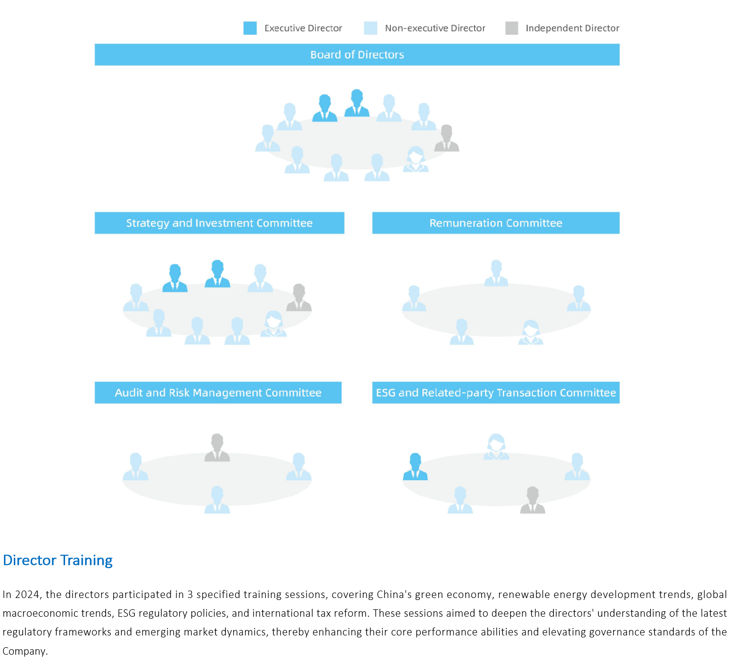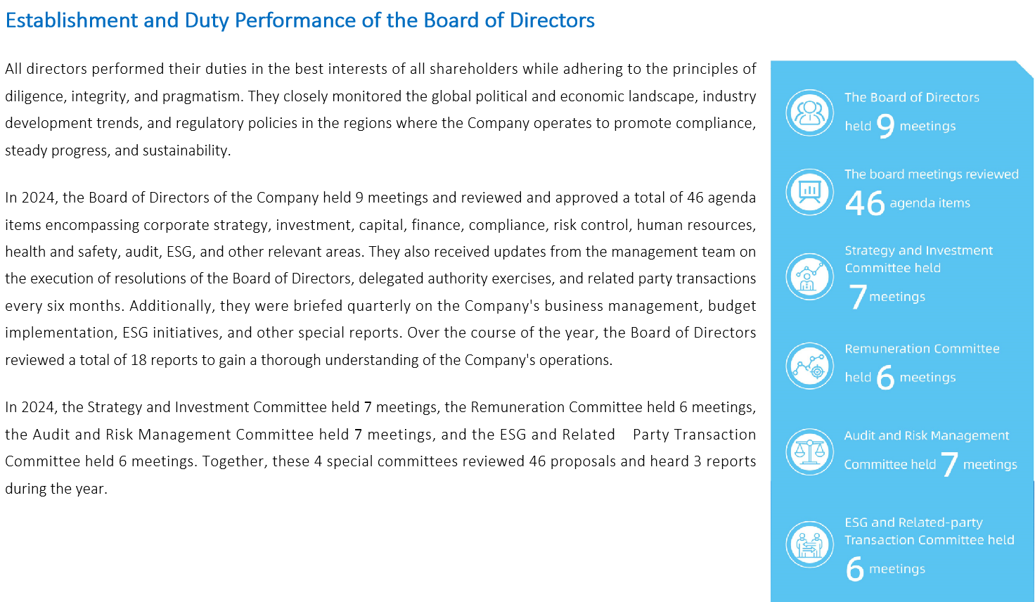 The ESG and Related-party Transaction Committee is primarily responsible for deliberating the?Company's sustainable development issues, examining the establishment, processes, and systems of?the Company's ESG framework, reviewing the Company's ESG vision, strategy, objectives, and social?responsibility project plans, evaluating the operation of the Company's ESG framework, identifying?pertinent risks and opportunities, and providing recommendations to the Board of Directors to?ensure the sustainability of corporate governance. The committee is also responsible for formulating?management policies concerning related party transactions of the Company, overseeing and?reviewing such transactions to ensure compliance with relevant laws, regulations, and the Company's?internal policies, ensuring the compliance of these transactions. Furthermore, the committee regularly?receives updates on the Company's information disclosure and engagement with stakeholders,?supervising and guiding these efforts to enhance the transparency of the Company.
